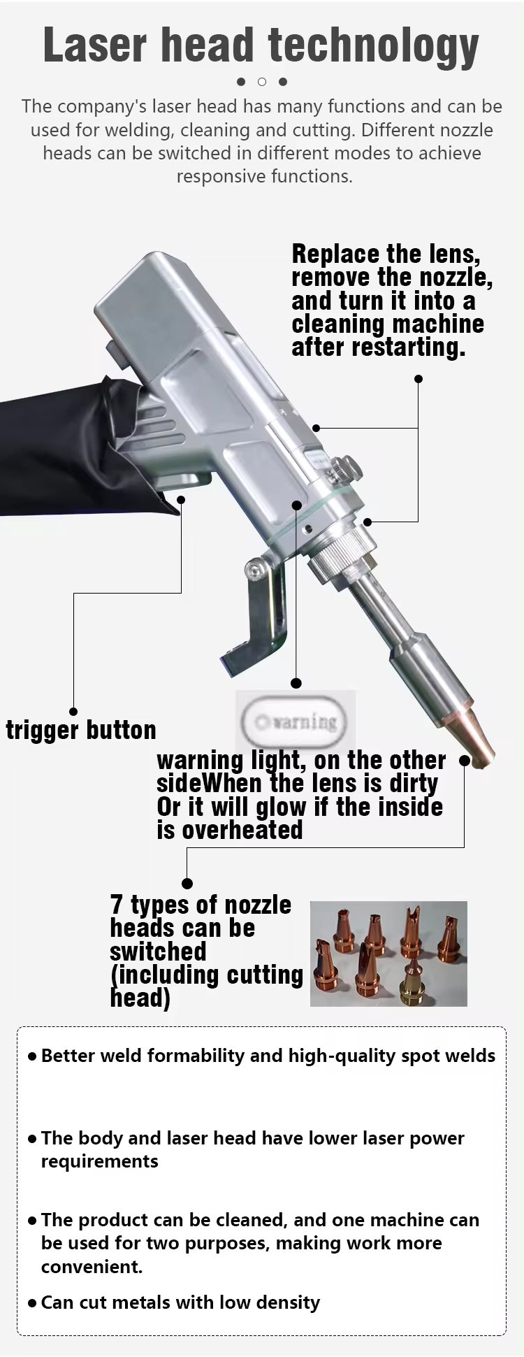 Função de limpeza de conversão de função de soldagem, basta substituir a lente de foco e a cabeça do laser;